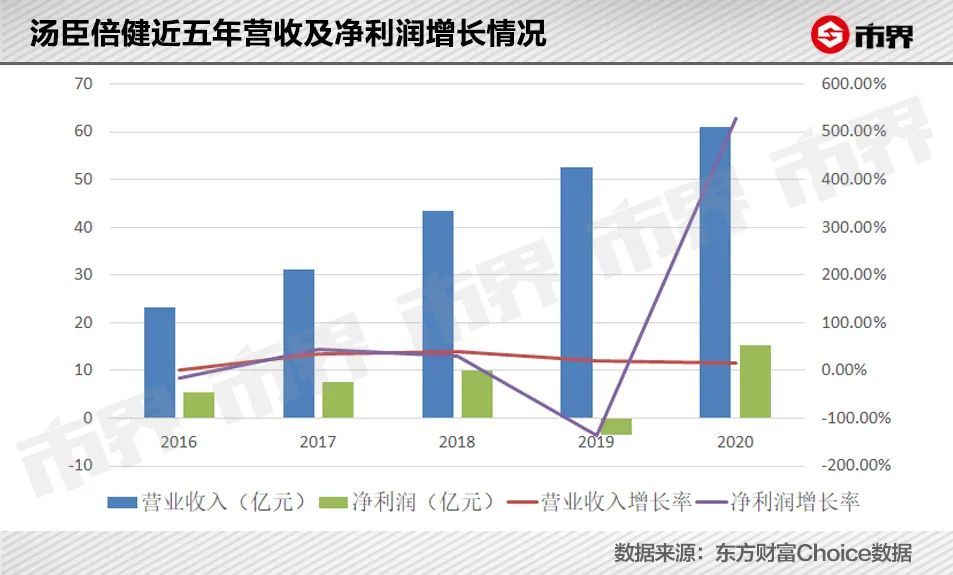 2020年,汤臣倍健实现营业收入60.95亿元,同比增长15.83%;净利润为15.24亿元,同比增长528.29%;扣非净利润为11.44亿元,同比增长365.82%。