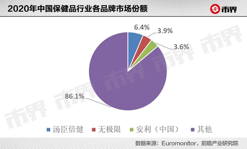 前瞻产业研究院数据显示,2019年,中国保健品行业的市场规模为3965亿元,市场占有率最大的前五大品牌依次为汤臣倍健、无极限、安利(中国)、完美(中国)、东阿阿胶。不过,直到2020年,前三大品牌也仅占据了13.9%的市场份额。