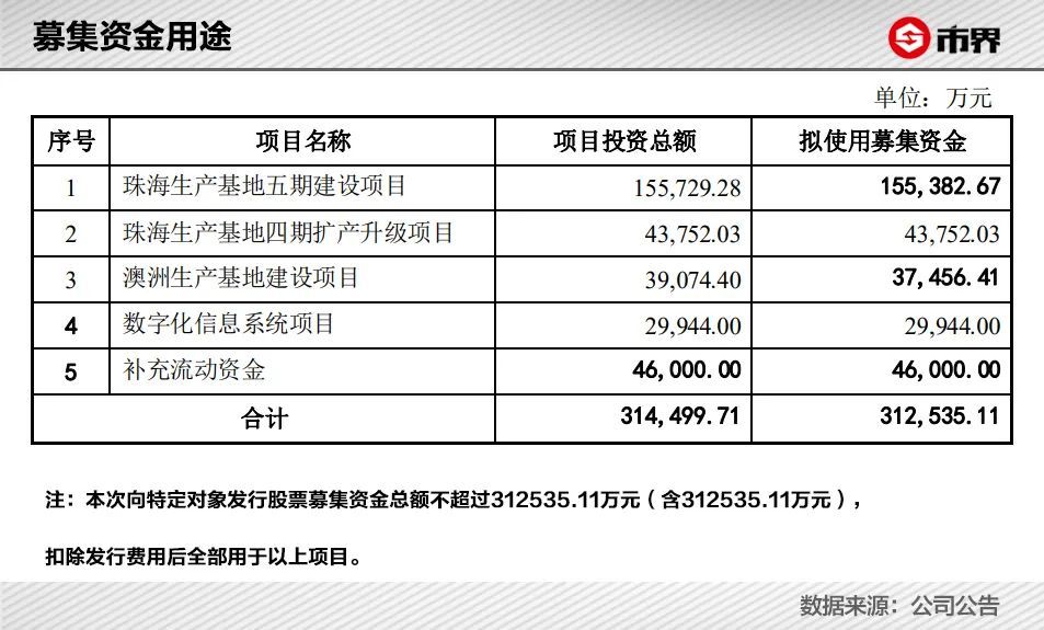 在珠海生产基地五期建设、珠海生产基地四期扩产升级这两个项目上,汤臣倍健将投入超过19.91亿元的募集资金,占此次募集总资金的比例近64%。